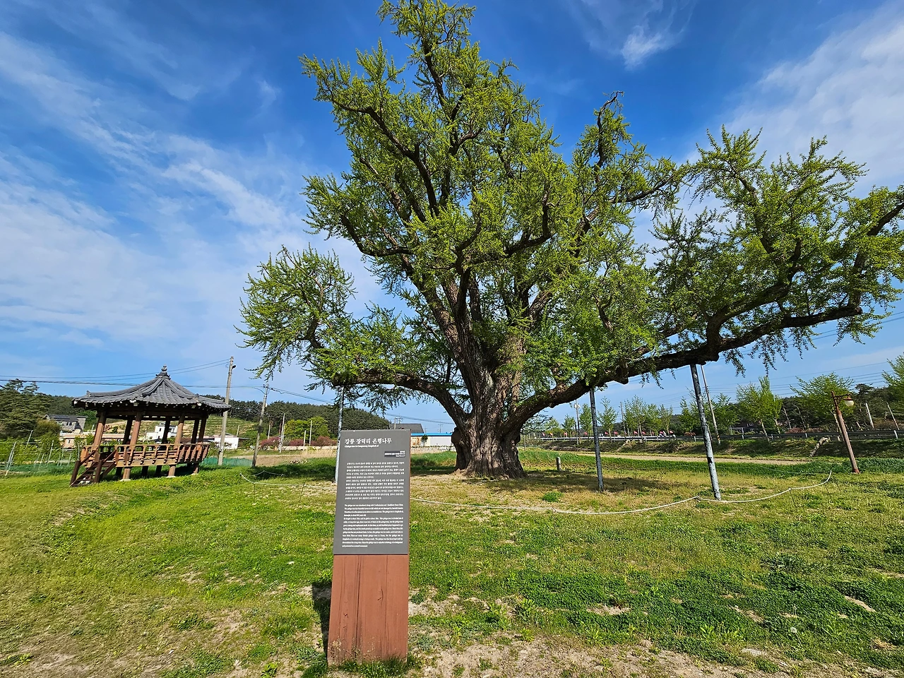 보통 이렇게 큰 나무들이 열매를 많이 맺는 암나무인데 반해 장덕리 은행나무는 수나무로 장수하고 있어 가치가 높다고 했다. 천연기념물로도 지정되어 마을 입구에서 수호신처럼 우뚝 서 있다. 초록잎을 틔우기 시작한 지금도 이렇게 늠름한 모습인데, 가을의 절정에서 황금빛으로 물들어 갈 모습은 또 얼마나 수려할지 생각만으로 가슴이 벅차올랐다.