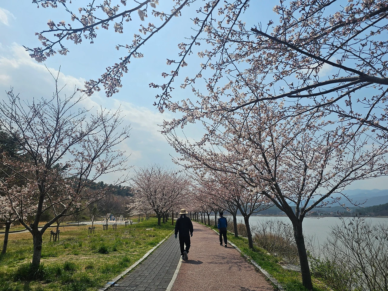 꽃길을 따라 도로에서 멀리 벗어날수록 벚꽃 향이 진하게 코를 간지럽혔다. 양양 남대천 벚꽃길을 걸으며 야리야리한 벚꽃에서도 그윽한 향기가 난다는 것을 처음으로 알았다. 아마 축제 기간 중에 차량 통제를 해서 향기를 더 잘 맡을 수 있었던 것 같다. 그 반가운 벚꽃 향기가 향호에 있었다.