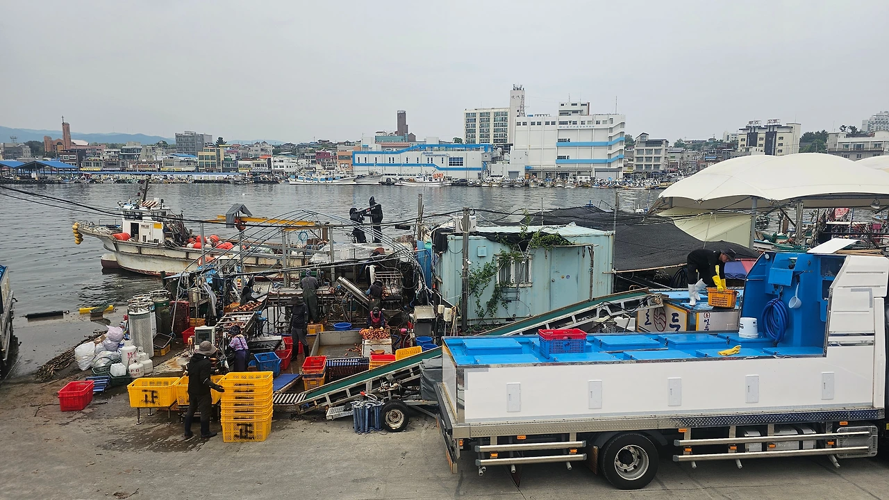 물통을 내려놓고 준비운동을 시작하는데 눈에 들어온 풍경이 낯설었다. 큰 트럭이 한쪽에 서있고 컨베이어 벨트를 닮은 기구가 부지런히 돌아가고 있었다. 걸음을 멈춰서 자세히 살펴보니 한 무리의 작업자들이 바다에서 막 따온 멍게를 선별하고 있었다. 그물에서는 바다의 심장 같은 뻘건 멍게들이 줄줄이 딸려 올라오고 있었다. 그것을 간단히 세척하고 나누어 물차에 싣는 작업이 한창이었다.