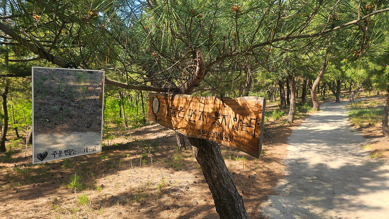 아침 일찍 남편을 회사에 내려다 주고 도립대 솔밭길로 향했다. 맨발로 고운 흙을 밟으며 어싱을 했다. 사람들이 걷기 좋도록 누군가 빗자루질을 해놓은 자국을 보며 고마운 마음이 들었다. '주문진 건강위원회'라는 곳에서 솔밭 산책로 곳곳에 좋은 글귀들을 붙여놓아 지루하지 않게 운동할 수 있었는데 이 날은 "거울은 먼저 웃지 않는다"라는 비장한 문구와 함께 걸어둔 거울에 유독 시선이 갔다. 화장기 없는 얼굴로 아침 일찍부터 걷기 삼매경인 나 자신을 칭찬해 주었다. 씽긋 웃어 보인 건 나에게 주는 선물이었다.
