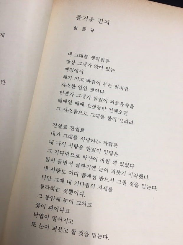 그래서 그의 시 <즐거운 편지>에는 사랑의 마음을 '사소한'이라는 단어로 표현할 수 있었다고 말했다. 사랑에는 아픔이 따르기 마련이지만 고3 때 쓴 이 시의 핵심인 짝사랑의 아픔은 격렬했다고 한다.