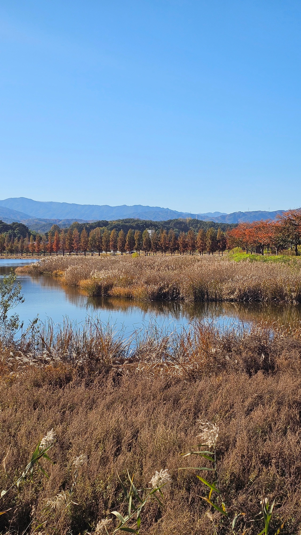 메타세쿼이아 나무 사이로도 자전거를 타고 달렸다. 그리고 크게 한 바퀴를 돌아 다시 원점으로 돌아왔다. 확실히 경포호 가까이보다는 강바람이 덜했다. 강릉은 여름 내내 극심한 가뭄에 시달리다가 10월에는 한 달 내내 비가 왔다. 정확히 말하면 이틀 빼고 내리 비였다. 가을하늘은 공활하다는 데 매일 비 오는 강릉에서 우리는 가을 중 한 달을 잃어버린 느낌이었다. 요즘은 체감상 가을이 점점 짧아져 과장 조금 보태 긴 여름 다음 바로 추워지는 느낌이라 아쉬웠는데, 이날은 무계획으로 간 가을 나들이가 최고의 순간을 만들어준 하루였다.