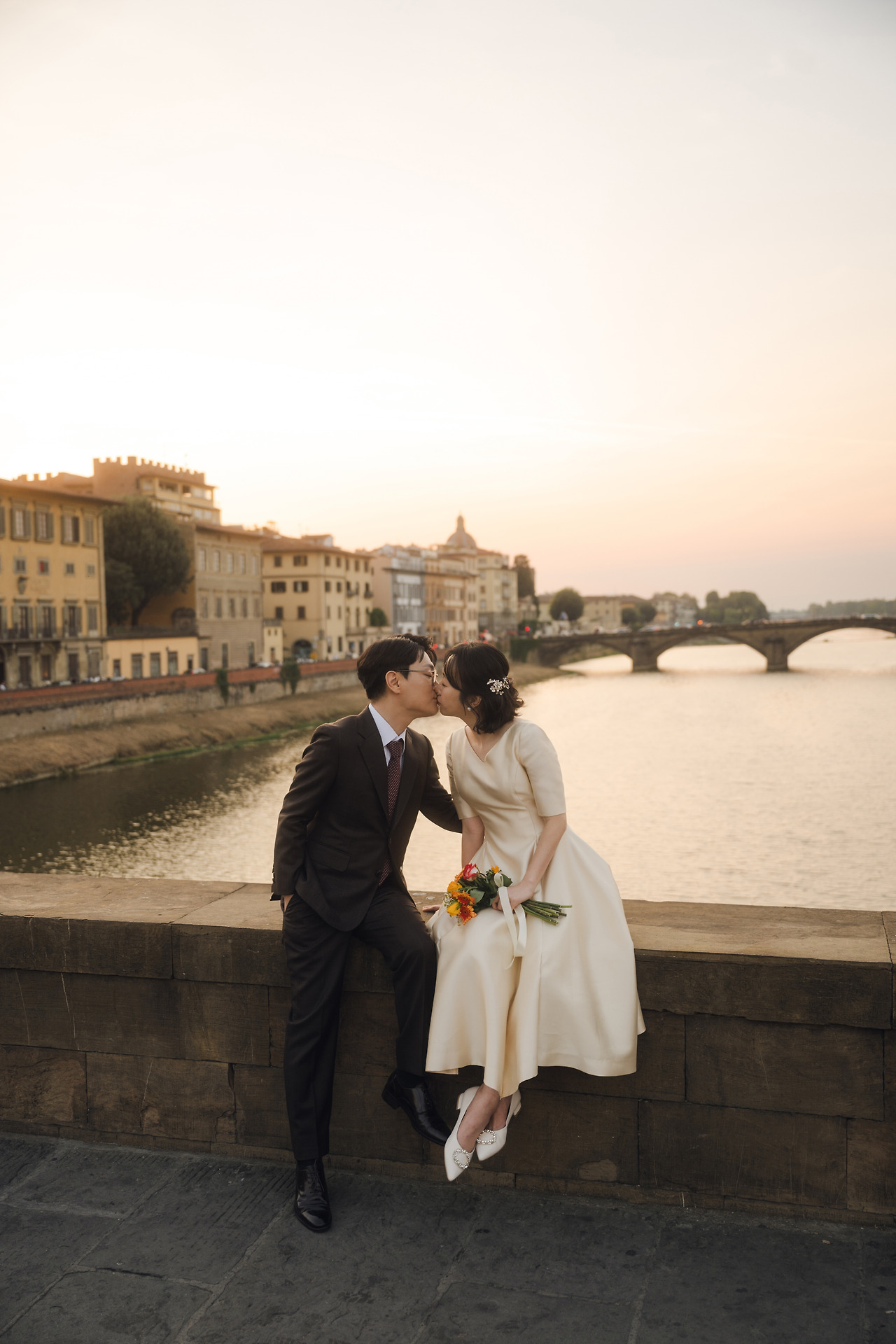 남편의 예복도 일부러 피렌체 도시 분위기와 잘 어울리는 색으로 골랐고, 나의 드레스 역시 샴페인 색에 미카도 실크 원단으로 고급스러움을 더했다. 새하얀 색보다 코랄 빛이 도는 은은한 샴페인 색이 나의 퍼스널 컬러라고 했다. 흰색에 미련이 없진 않았지만, 그래도 '피렌체'와 잘 어울리는 건 역시 후자였다.