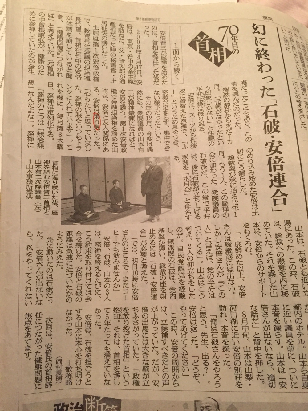 '70년째의 수상(70年目の首相)'이라는 제목으로, 아베 신조 수상이 지난 7월 24일 도쿄 야나카(谷中)에 있는 선사 '젠쇼안(全生庵)'에서 좌선을 했다는 내용이다.