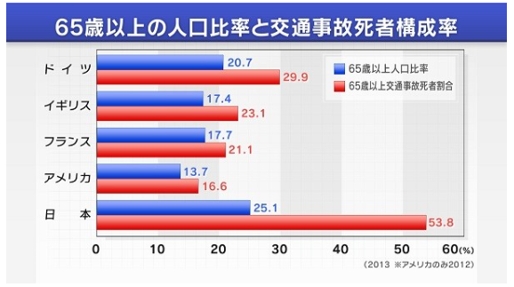 '65세이상 인구비율과 교통사고 사망자 구성비'란 제목으로, 파란색이 65세이상 인구비율, 빨간색이 사망자 비율이다. 맨위가 독일, 영국, 프랑스, 미국, 일본 순이다. 일본이 고령화가 상당히 진행됐다고 해도, 이상하리만치 사망자 비율이 높다.