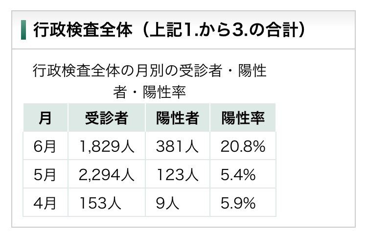 아래는 신주쿠구청이 내놓은 자료로, 지역 내 민간 검사를 제외한 보건소검사를 기록해 놓은 자료다. 6월 양성률이 무려 20.8%에 이른다. 검사체제가 다소간 확보됐다고 하나 이미 따라잡기 어려운 속도로 퍼지고 있었던 셈이다.