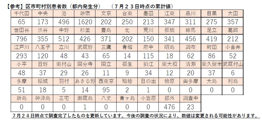 아래는 어제 발표된 도쿄도내 감염자숫자다. 신주쿠(新宿, 맨위 왼쪽에서 네번째)가 1620명으로 가장 많은 걸 알 수 있다.