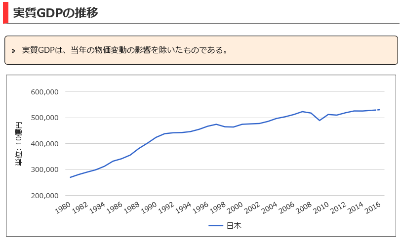 하지만, 90년대에 들어와 버블이 터지고, 성장속도가 둔화되기 시작한다. 그럼에도, 일반적으로 한국에서 생각하는 것처럼 일본 경제는 수치상으로 크게 추락한 적이 없다. 성장속도가 느려졌다 뿐이지, 규모자체는 꾸준히 유지해왔다.