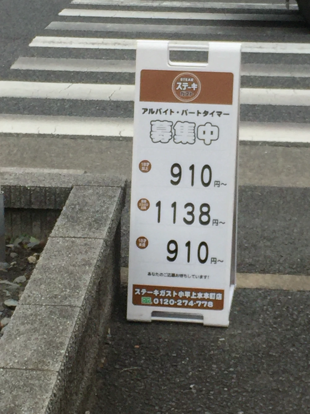 그럼 알바의 시급은 대체로 어떻게 될까. 일단 첫번째 사진은 현재 머무르는 도쿄 코다이라시(小平市)에 있는 패밀리레스토랑 스테이크 가스토(ステーキガスト)의 알바 모집 간판이다.