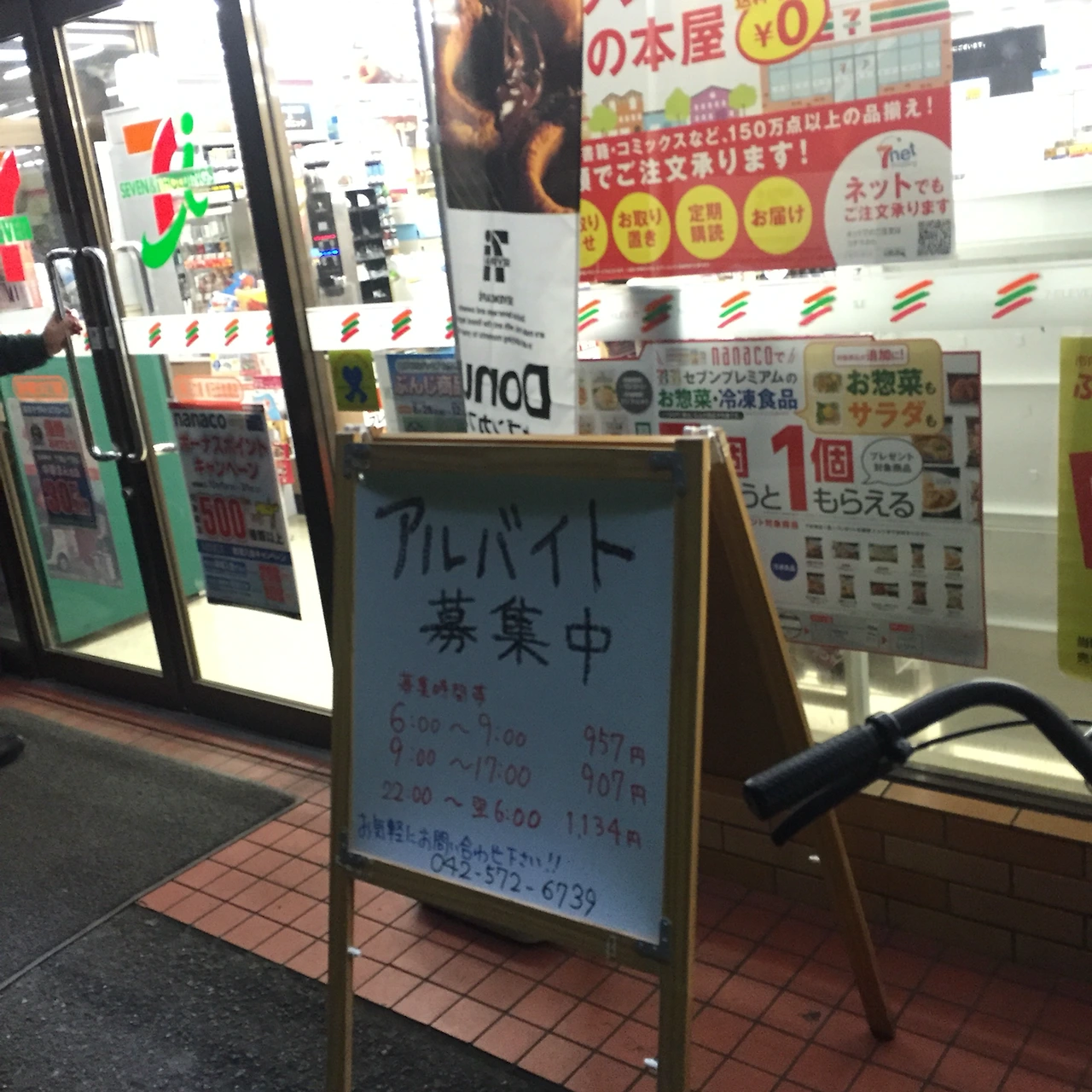 듣던 대로 상당히 높음을 알 수 있다. 시간과 나이대별로 다르지만, 910엔 혹은 1138엔부터 시작한다. 10월 23일 환율기준으로 보면(100엔=937원), 8526원, 1만663원이다. 일본 알바 시급은 이른 시간이나 늦을수록 높아지고, 대낮일수록 낮다. 외식업과 함께 알바의 한 축을 이루는 편의점도 크게 다르지 않다. 아래 사진을 보자.