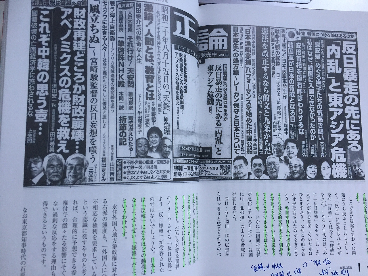 최근 읽은 책 가운데서 재미난(?) 대목이 있어 간단히 인용해본다. 책 이름은 '증오의 광고(憎悪の広告)'다. 90년대 이후 우익성향 주간지의 신문 광고를 하나하나 분석해 극우의 사상적 흐름을 논하고 있다.