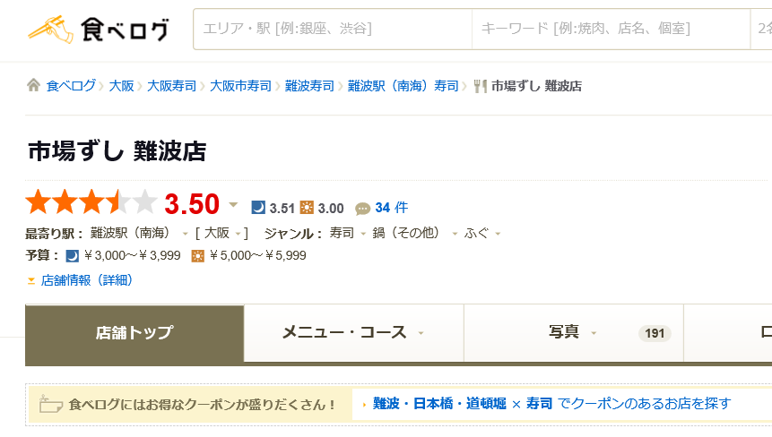 대체로 좋은 평가가 많았다. '서민의 편', '큰 재료(네타라고 한다)를 가성비 좋게 제공한다', '난바에서 본격적으로 먹을 수 있는 곳'. 다만 시기적으로 작년까지 리뷰에 좋은 평가가 집중돼있다.
