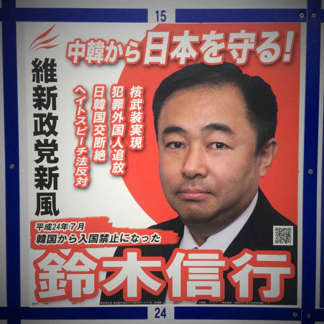 해당 후보자는 유신정당신풍이라는 곳의 후보로 출마한 스즈키 노부유키라는 사람이다. 문구를 하나하나 보자면 "중한(中韓)으로부터 일본을 지킨다." "핵무장실현, 범죄외국인추방, 한일국교단절, 헤이트스피치법 반대", "한국에서 입국금지된 스즈키 노부유키" 등 당당하게 주장을 펴고 있다.