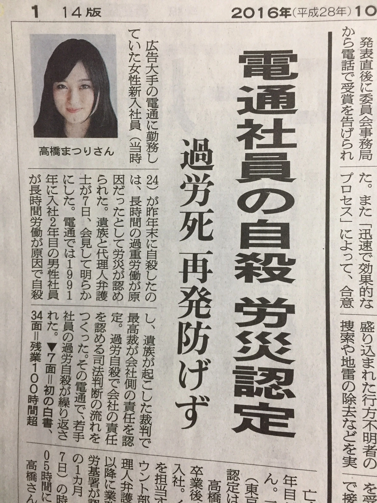 광고대기업 덴츠의 신입사원이었던 다카하시 마츠리씨(당시24세)가, 과로자살에 대한 산재인정을 받았다. 모친인 코미씨(53)는 7일 후생노동성에서 기자회견을 열어 "산재인정을 받아도 딸이 돌아올리 없다. 목숨보다 소중한 일은 없다. 과로사를 반복하지 않길 바란다"고 호소했다.