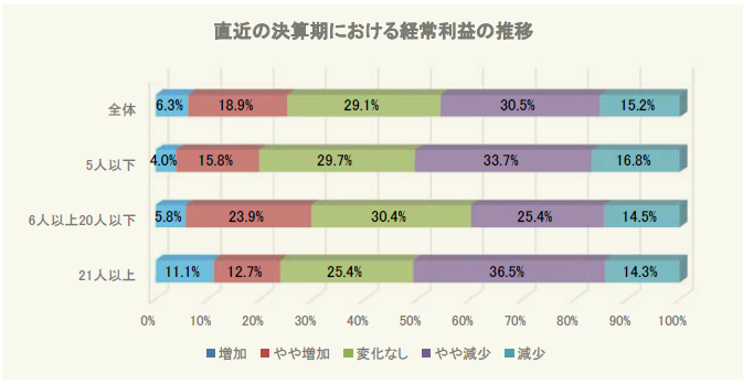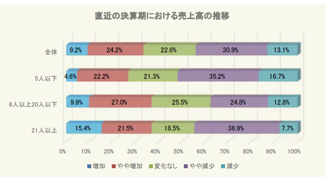 구체적으로 보면 '부익부 빈익빈'이랄지, 업체 규모가 커질수록 매상 증가 현상이 나타남을 알 수 있다. 5인 이하 업체는 감소쪽이 압도적으로 크다. 21인 이상 업체라면 사실상 기업형에 가깝기 때문이다.