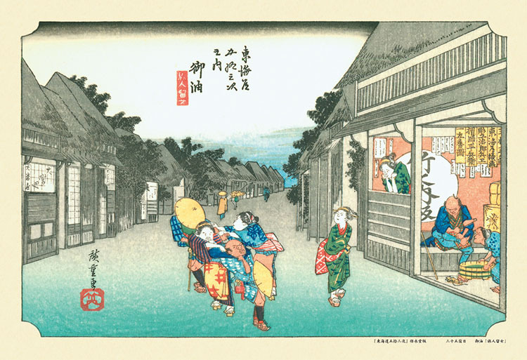 당시 유명한 길이, 도카이도(東海道)(오사카, 교토 등 간사이~도쿄)로서, 이 길은 일본 영주(大名)가 오간 길이면서, 조선통신사들이 에도로 향한 길이기도 하다. 현재에는 도카이도 신칸센과 도카이도선으로 일본 동부와 서부를 잇는 교통의 중요한 축이 되어 있다.