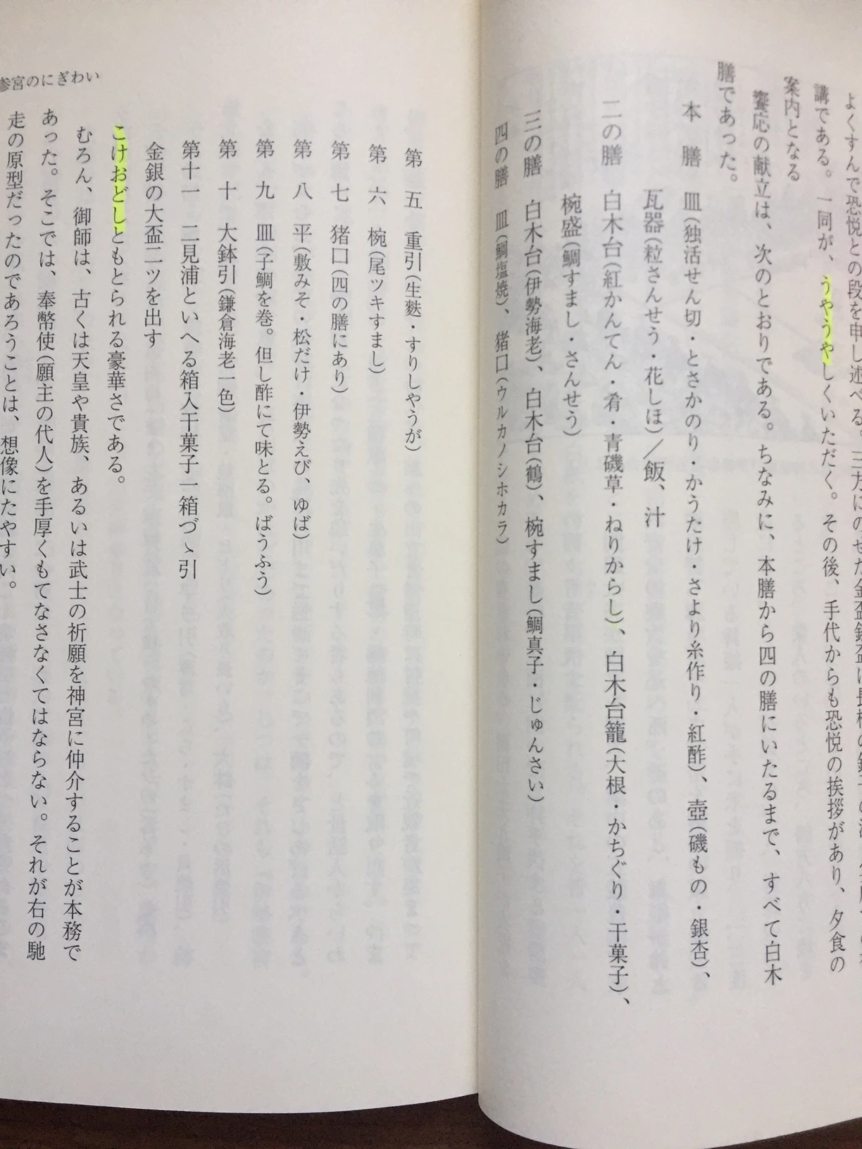 에도시대 서민으로서는 그야말로 일생일대의 경험이었다. 당시 숙소에서 나오던 음식(저녁의 경우)을 간단히 소개해보자면,