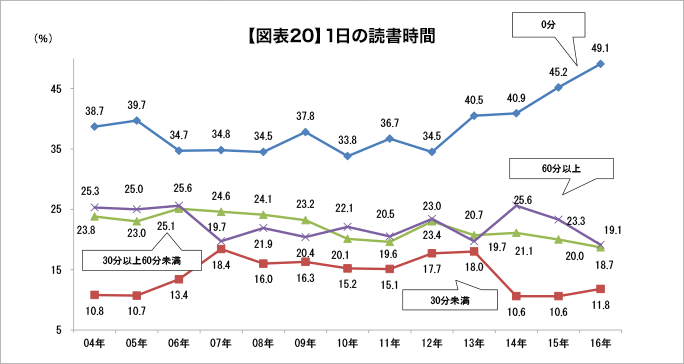 아래는 일본대학생협에서 조사한 대학생들의 하루 평균 독서 시간 추이다. 평소 그런 대로 책을 읽는 학생들보다, 눈에 띄는 변화가 나타난 게 '0분(0分)', 즉 책을 아예 안 읽는 학생(맨위선)의 증가 추세다.
