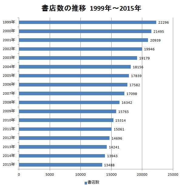 아래 그래프는 1999년 2만2296곳이었던 서점수가 2015년 1만3488로 대폭 줄어들었음을 보여주고 있다. 매년 평균적으로 500여곳이 문을 닫고 있는 셈이다.