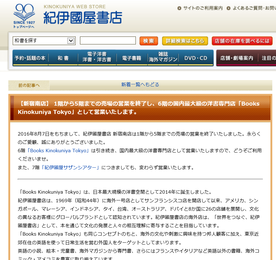 키노쿠니야 서점은 1927년 탄생한 역사 있는 대형 체인으로, 본점은 신주쿠 미나미 지점에서 멀지 않은 신주쿠 3초메(3丁目)쪽에 있다. 신주쿠 미나미 지점은 1996년 전국 최대 규모로 화제를 모았지만, 결국 임대료를 내지 못해 폐점에 이르렀다고 한다.
