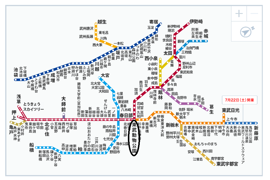 주로 도쿄와 사이타마 지역을 잇는 도부철도(東武鉄道)를 한 번 보자. 아래 노선도 한 가운데 '도부동물공원'(東武動物公園)이라는 이름의 역이 있다. 말 그대로 동물원과 테마파크가 함께 있는 곳이다.