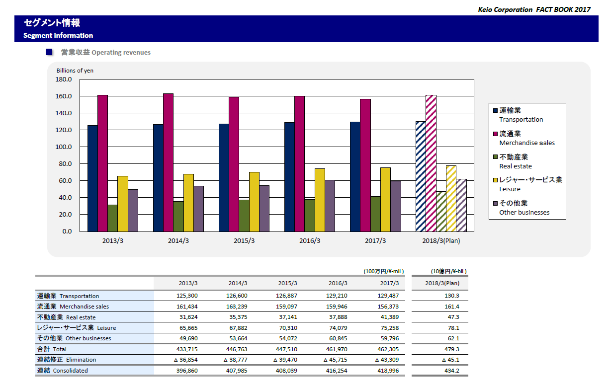 한 군데만 더 보자. 서부 도쿄 베드타운지역을 JR과 양분하는 케이오그룹이다. 유통업이 운송업보다 매출규모가 더 크고, 부동산과 레저서비스 비중도 상당하다. 큰 역에는 케이오슈퍼나 백화점이 들어가있어, 사실상 역과 일체화돼있다.