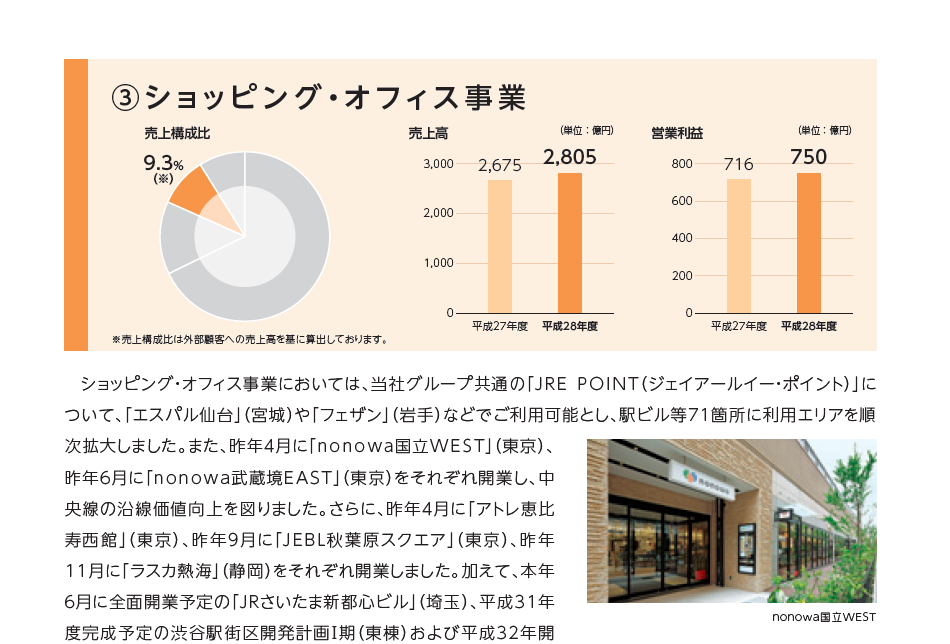 JR히가시니혼은 회사 규모가 큰 만큼, 보유 부동산도 많다. 소개하고 싶은 것 가운데 하나는 철도 고가화 사업으로 생겨난 땅(즉, 다리 아래)에 상가를 유치한 'NONOWA' 사업이다.