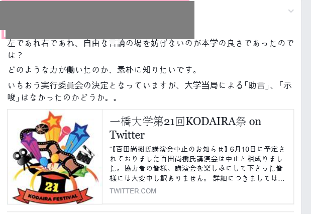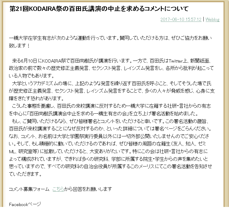 아래는 히토츠바시대학 페이스북 페이지에 올린 한 우익 졸업생의 투고 내용이다.