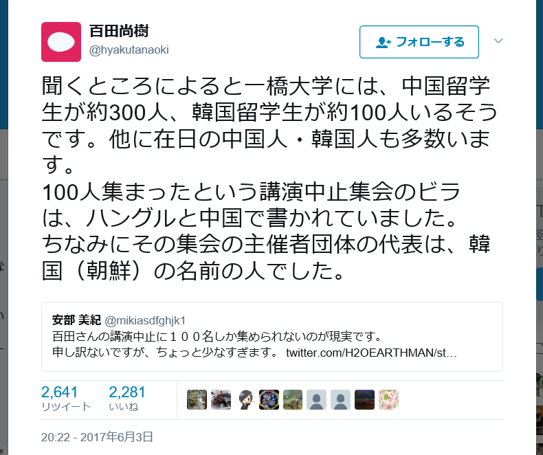 듣자하자 히토츠바시대학에는 중국유학생이 약 300명, 한국유학생이 약 100명 있다고 합니다. 그밖에 재일(비하적 의미)인 중국인, 한국인도 다수 있습니다. 100명 모였다고 하는 강연중지집회의 팸플릿은, 한글과 중국(어)로 쓰여져 있습니다. 주최자 단체의 대표는 한국(조선) 이름인 사람이었습니다