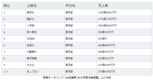 일본 출판사들이 1년간 내는 매출부터 살펴보자. 2012년 자료지만 각사의 최근 수치를 비교해봤을 때 큰 차이는 없어서 잘 정리된 표를 그대로 옮겨본다.