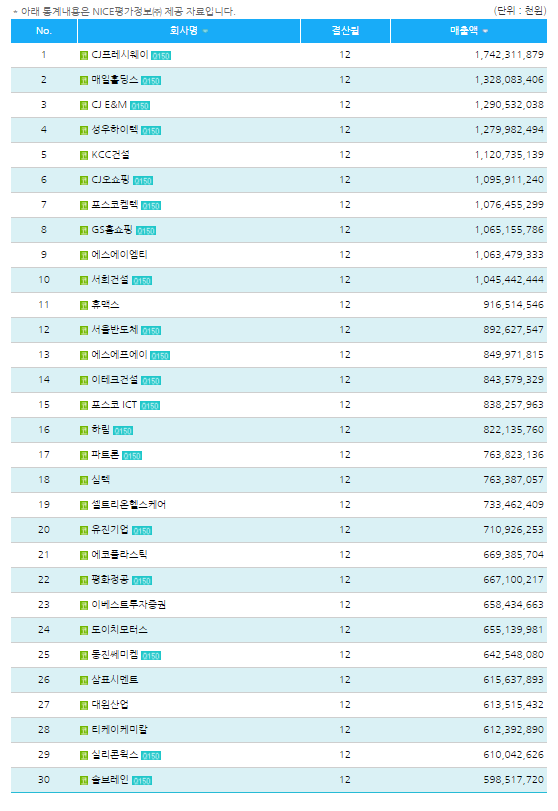 이 정도 규모라면 한국에선 어떤 기업이 해당될까. 코스닥 상장사 기준으로 매출 순위를 매겨봤다(상위 30).