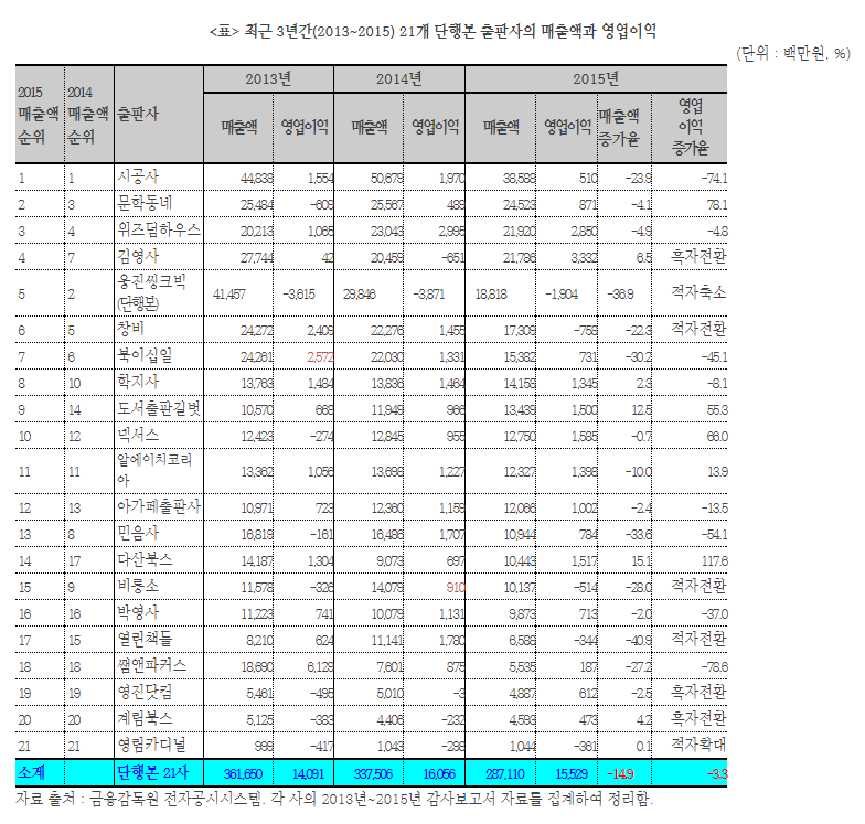 2015년 기준 가장 매출이 많다는 시공사가 385억원이다. 문학동네(245억원), 위즈덤하우스(219억원), 김영사(217억원)이다. 이곳에 나온 출판사 21곳 합계 매출액은 2871억원이다. 일본의 6위 출판사(宝島社) 한 곳 매출액 수준이다.