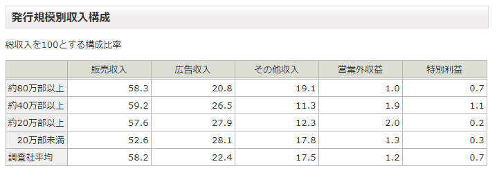 2015년 집계 자료로, 표 상단 맨 왼쪽부터 '판매수입' '광고수입' '기타 수입' '영업외수익' 등이 나와 있다. 전체 비율을 100으로 정하고 각각 나눈 것이다. 왼쪽은 부수를 나타낸 것으로 위에서부터 '약80만부이상' '약40만부이상' '약20만부이상'이다. 맨밑은 전체 평균이다.