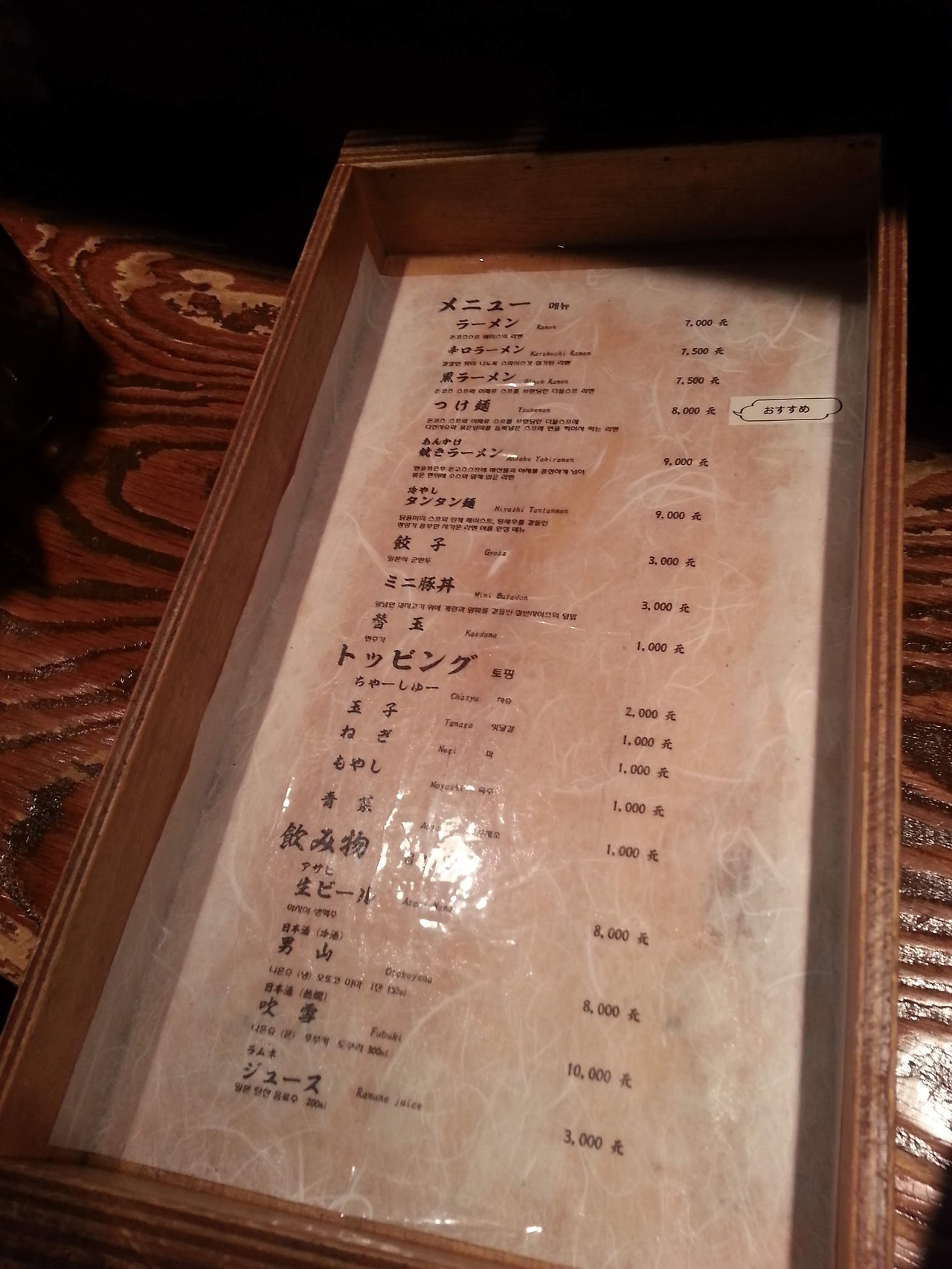 그런데 그다음 경험은 사실 꽤 힘들었습니다. 메뉴판에는 일본어와 영어, 그리고 미맹인 저에게 너무나 어려운 한국어로 된 라멘 설명이 있었습니다. 그래서 가격만 보고, 너무 싸지 않고 너무 비싸지도 않은 메뉴를 시켰습니다. 인생 첫 츠케멘을 먹게 됐습니다. 제 입맛에 맞더라고요. 그러곤 라멘을, 일본을, 그리고 멘야산다이메를 좋아하는 사람이 됐습니다.