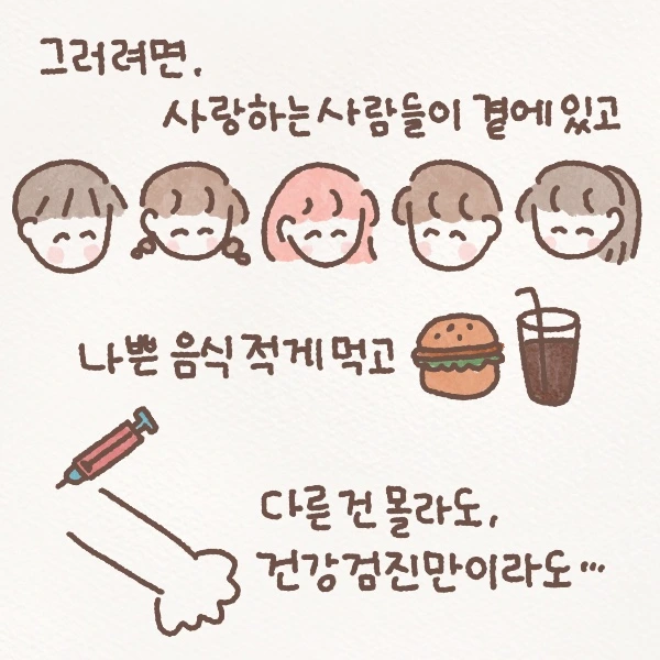 그러려면 어떻게 해야 할까. 사랑하는 사람들이 항상 주위에 있으면 좋겠지. 그리고 나쁜 음식을 적게 먹고 적당히 움직이고 정기적으로 최소한의 검진이라도 받아야 한다.