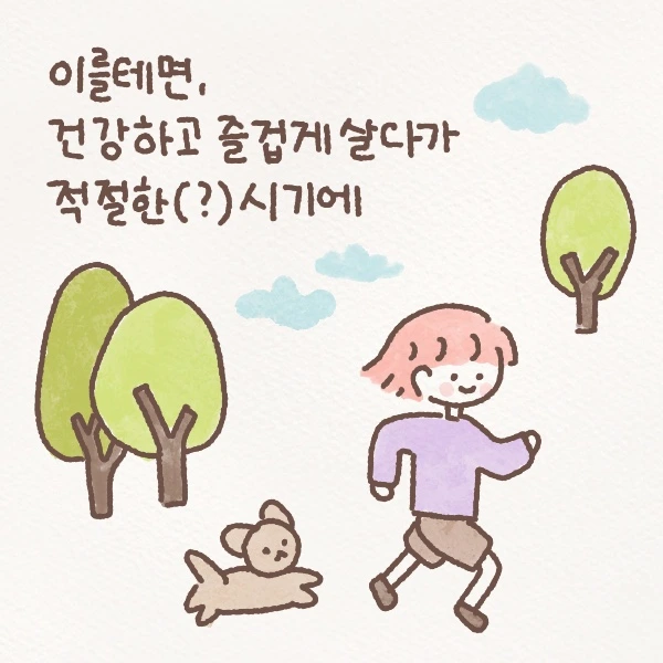 이를테면, 건강하고 즐겁게 살다가 적절한 시기에 외롭지 않고 두렵지 않은 죽음을 맞이하는 게 최종 꿈인데, 여기서부터 거슬러 올라가는 것이다.