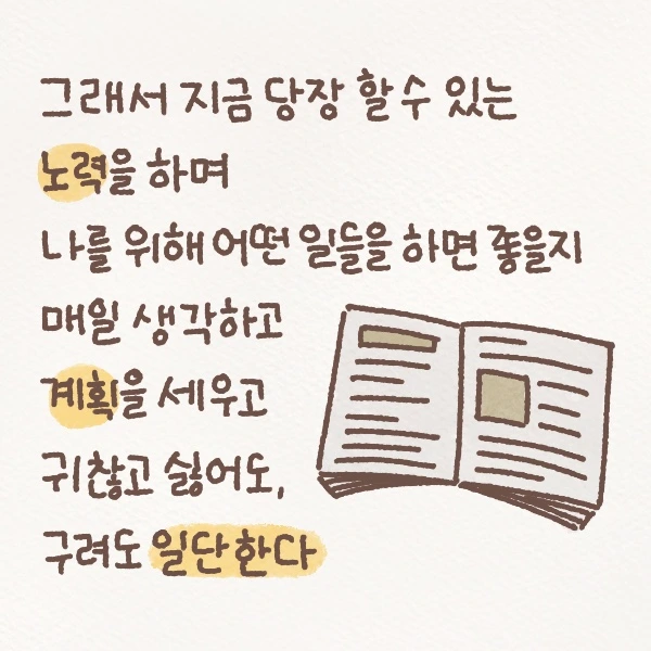 그래서 소소할지라도 지금 당장 할 수 있는 노력을 하며, 나를 위해 어떤 일들을 하면 좋을지 매일 생각하고, 계획을 세우고, 귀찮고 싫어도 일단 한다. 구려도 한다. 이 구리다는 부분이 가장 견디기 힘들지만...