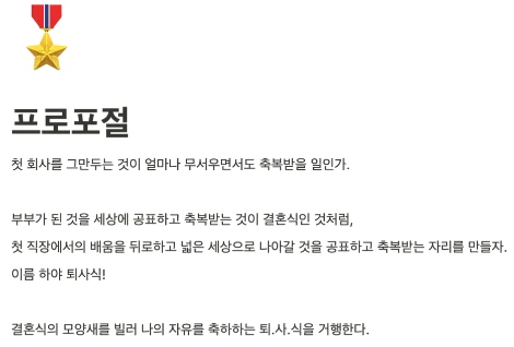 두사람의 선택을 사회 앞에서 인정받고, 축복받는 것이 '결혼식'인 것처럼, 회사를 그만두겠다는 나의 선택을 응원받는 자리를 '퇴사식'이라고 이름 지었다.