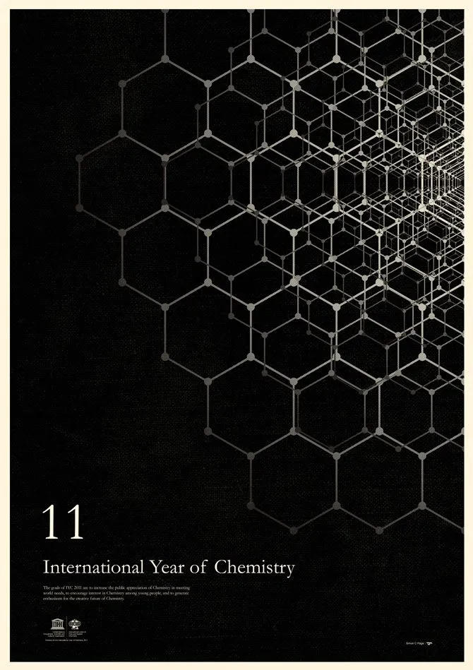 화학구조를 활용한 패턴을 사용해 'International year of chemistry'라는 주제를 더 잘 알 수 있는 포스터 디자인입니다.