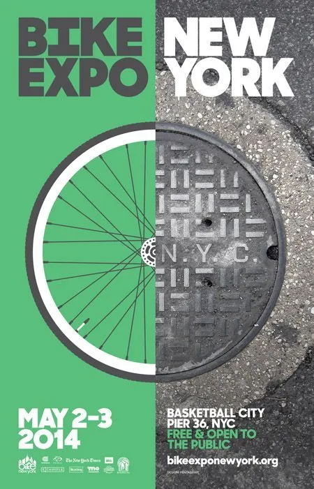 일러스트를 활용하여 자전거 바퀴를 표현하였고, 뉴욕이라는 장소를 맨홀을 통해 나타내었습니다. 바퀴와 맨홀을 절반으로 나누어 위트 있게 엑스포에 대한 정보를 알려주고 있습니다.