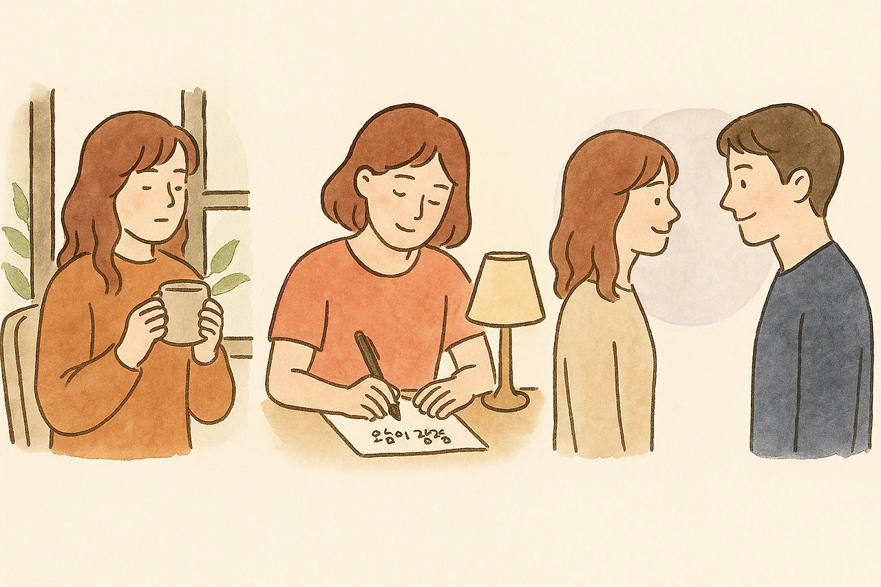 인간관계에서 갈등이 생기고 오해를 하게 되는건 우리가 만들어내는 스토리 때문입니다. 즉 상황과 사건때문이 아닙니다. 그것에 따른 인식과 각자의 해석이 갈등을 만들어내는것이지요. 무슨일이 일어난 것인지 이해한다는것은 자신이 어떤 상황에서 어떤 감정을 느끼는지. 어떤 생각을 하는지 관찰하고 패턴을 발견했다는 이야기입니다. 객관적인 사실유무를 확인하면 될 상황에서도, 감정의 개입이 들어가면 인지왜곡이 생길수 있습니다. 스트레스를 받을수록, 뇌 과부하가 될수록 뇌는 스토리를 만들어냅니다. 일명 소설쓴다는 이야기가 있잖아요. 그 말처럼 상처받았던 부분이 건드려지거나 연약한 부분이 닿는순간 우리 뇌는 이야기를 만들어냅니다. 저는 지금처럼 작가가 되기전, 관계가 많이 어려웠습니다. 부끄럽지만만 관계에서 소설 많이썼습니다. 혼자 서운해하고, 오해하고. 상처받고, 아픔을 반복하다가 원인이 제게 있었음을 발견했습니다. 그랬던 제가 해봤던 방법중 관계가 어려운분들께 세가지를 소개해드립니다.