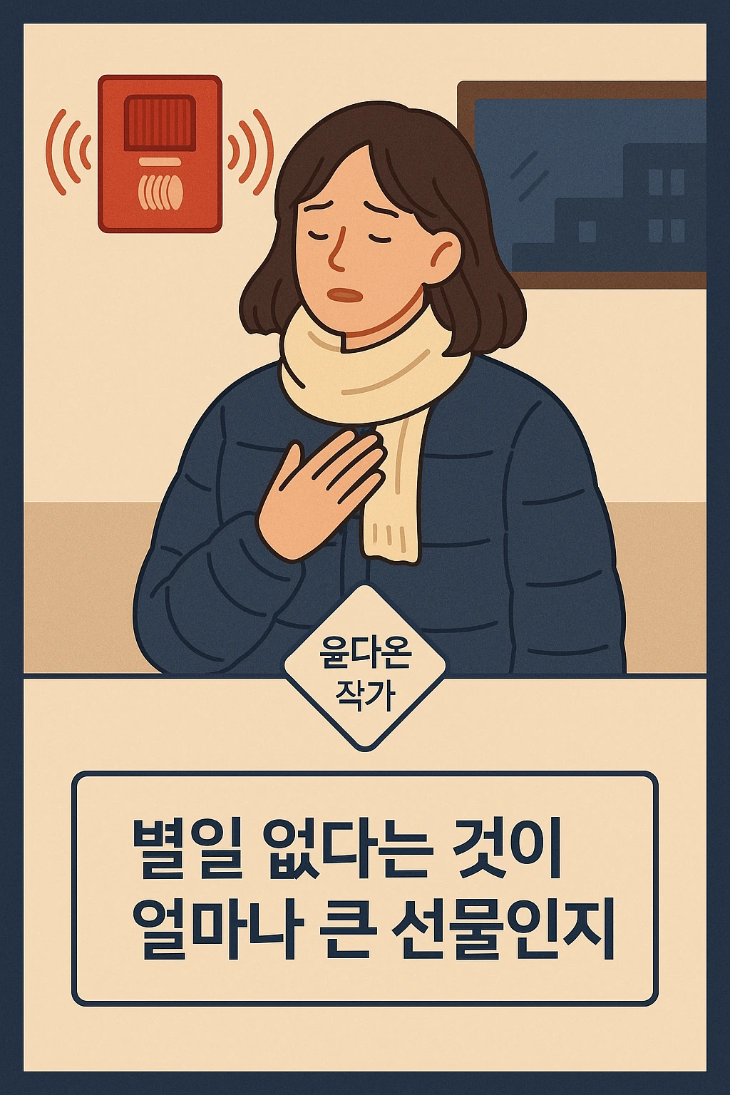 그러나 오늘은 달랐다. 잃을 수도 있었던 하루를 잠깐 스쳤기 때문일까. 그 짧은 순간이 나에게 이상한 감동을 남겼다. 경보가 진짜 화재가 아니었다는 사실. 사람들이 안도의 숨을 내쉬었다.