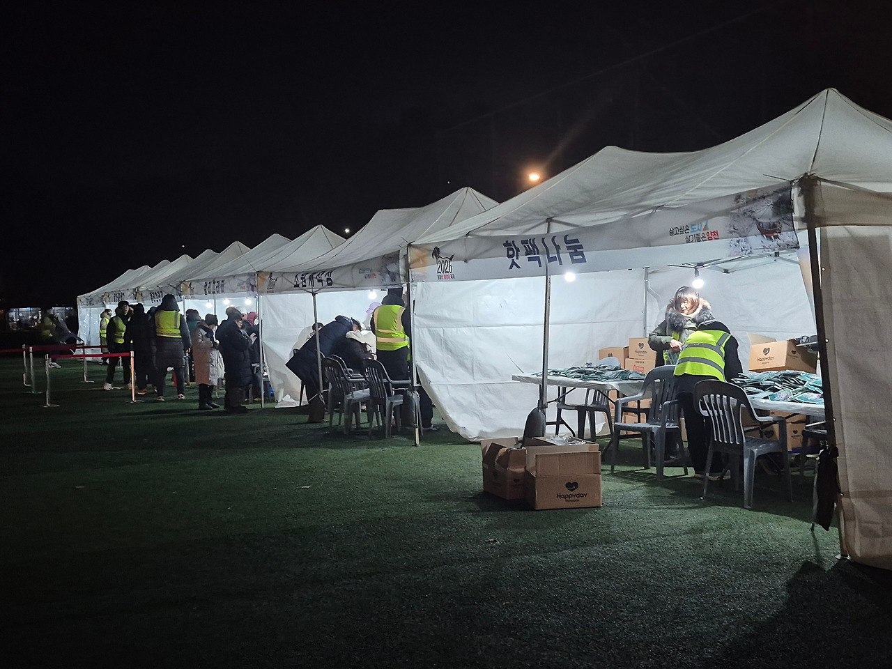 운동장 한가운데에는 여러 개의 천막마다 각종 부스가 설치되어 있었다. 핫팩 나눔, 복떡 나눔, 소원지 쓰기, 온기 나눔터, 캘리그라피 등 이름만 보아도 정겨워, 참여해 보고 싶었다. 잔디밭 두 군데나 이동식 난로까지 세워놓는 세심한 배려에 마음이 절로 따뜻해졌다. 옆에 서서 언 손을 녹이다 보니 '내가 잠든 사이 밤을 꼬박 새운 사람이 있었구나.' 하는 생각이 들었다. 사람들의 가슴에 새해의 설렘을 새겨주기 위해 이렇게 보이지 않는 손길로 고생했을 분들을 상상해보았다.