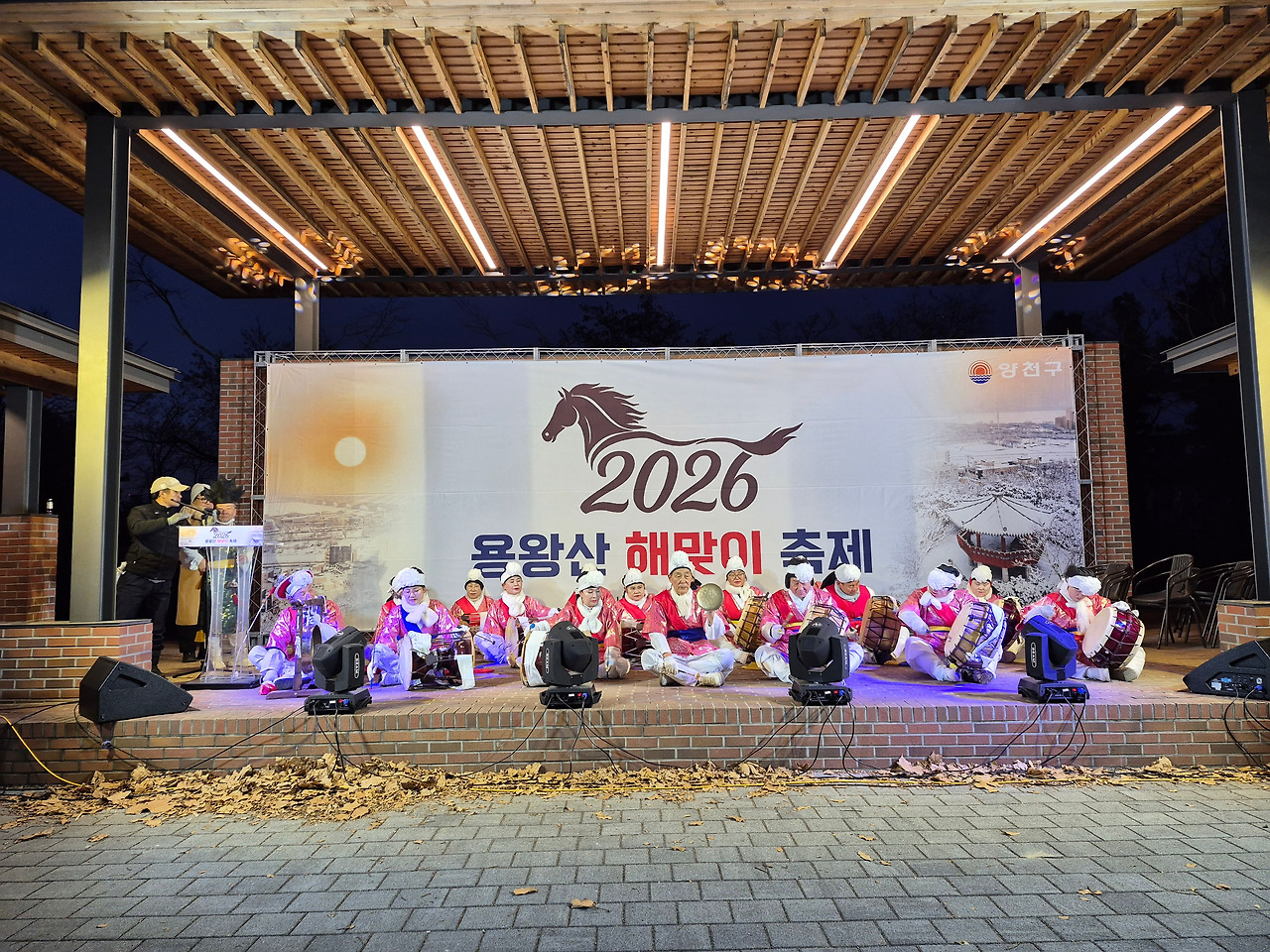 무대 쪽으로 가니 '2026년 해맞이 축제'라는 글자가 환하게 빛나고 있었다. 사회자는 추위에 몸을 떨며 마이크 테스트를 하고 있었고, 출연자들은 부스 안에서 잠시 숨을 고르고 있었다. 사회자가 조영구 씨라는 말에 주변이 잠깐 술렁거렸다. 나는 언니들한테 새해 첫날, 연예인과 함께하는 사진을 한 장 남겨주고 싶어서 꼬드겼다.