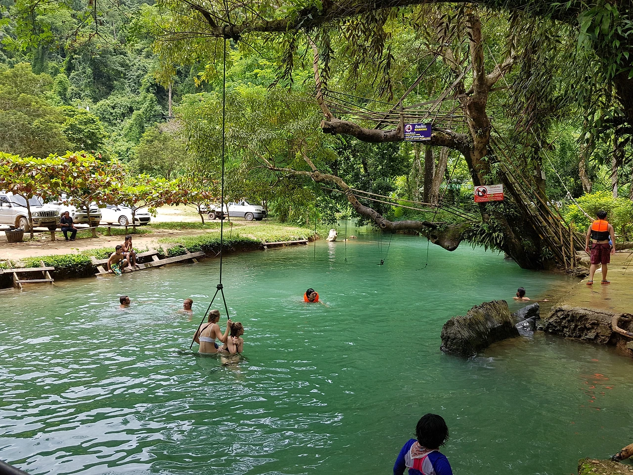 그곳의 액티비티는 수영과 다이빙이다. 5m 높이와 7m 높이의 다이빙대가 있었다. (놀랍게도 다이빙대는 아니고 그냥 나무이다.) 그곳에 많은 여행객들이 다이빙을 재밌게 즐기고 있었다. 모르는 사람이지만 다 함께 카운트 다운도 해주고 '할 수 있어!'라고 응원도 해주고 있었다. 나도 뛰고 싶었다. 처음엔 마음의 준비로 5m를 뛰었다. 사실 이 높이는 다이빙을 하는 거 같지도 않았다. 그냥 점프 정도? 그래서 바로 7m로 올라갔다. 7m에 올라가니 이 높이 꽤 높았다. 2m 차이가 이 정도 인가 싶었다. 쬐그마한 내가 올라가니까 밑에 있는 사람들이 you can do this! come on! jump! 외치며 응원해 줬다. 기분이 좋았다. 처음 본 누군가가 나를 응원해 주다니. 그래서 사람들의 카운트 다운 소리에 맞춰 뛰어내렸다.