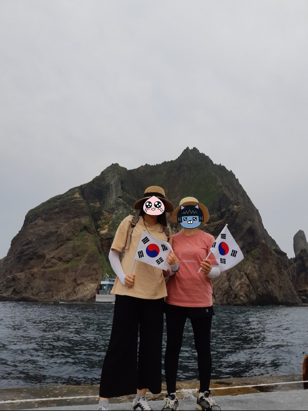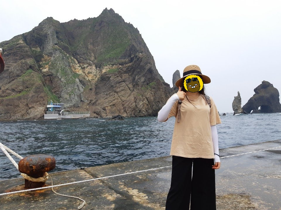 다시 도동항으로 넘어왔다. 왜냐하면 독도에 가기 위해서이다. 대망의 독도에 가는 날! 배에 오르기 전에 식사를 하기로 했다. 근처 식당에 들어갔다. 당연히 이곳도 홍따밥이겠거니 했는데 이 식당은 명이나물김밥을 팔고 있었다. 뜻밖의 횡재에 명이나물 김밥을 세줄을 먹은 것 같다. 그런데 식당 아주머니께서 관광객인 우리를 알아보시고 독도에 가냐고 물어보셨다. 식사를 마치고 독도 가는 배에 탈거라고 대답했다. 그런데 우리가 도착한 날부터 독도 가는 배 출항이 연달아 취소되고 있다고 말씀하셨다. 원래 울릉도에서 독도까지의 바닷길은 파도가 강해서 운이 좋은 사람만 갈 수 있는 곳이 독도라고 하셨다. 그때부터 조금 걱정이 되었다. 사실상 독도에 가려고 울릉도에 온 건데... 출항이 취소되지 않았으면 하는 마음에 예정대로 배 멀미약을 샀다. 운이 따라 준 걸까 우리는 다행히 독도 땅을 밟을 수 있었다. 독도는 독도 노래의 가사답게 조금은 외로워 보였다. 큰 바위, 작은 바위 2개로 이루어진 섬. 대한민국의 최동단. 그곳에서 태극기를 들고 사진을 찍었다. 독도에서 우리에게 허락된 시간은 길지 않다. 그 30분 남짓 시간 동안 독도를 계속 바라보고 돌아왔다.