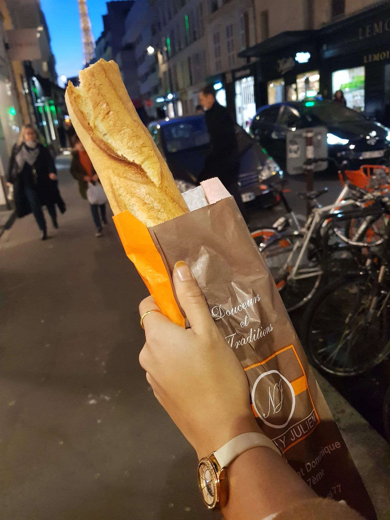 해가 거의 질 때까지 에펠탑을 구경하고 걸어서 숙소로 돌아갔다. 그런데 숙소로 가는 길에 사람들이 줄을 서고 있는 가게를 발견했다. 대체 무슨 가게 이길래 줄을 섰지? 하면서 살펴보니 베이커리였다. 현지인이 줄을 서는 베이커리라니! 너무 궁금해서 자연스럽게 우리도 그 줄에 합류했다. 가게 안으로 들어가니 파이들이 정말 많았다. 무엇을 먹을까 고민하다가 체리파이, 애플파이, 바게트. 이렇게 샀다. 파이들은 호텔에 들어가서 먹기로 하고 바게트는 걸으면서 먹기로 했다. 그렇게 맨 바게트를 입에 물었는데! 정말 너무 맛있었다. 아무런 소스 없이 빵만으로도 이렇게 맛있을 수가 있는 걸까? 호텔에 들어가서는 바로 파이를 먹었다. 정말 너무 맛있었다. 사실 나는 타르트, 파이류의 빵들을 별로 좋아하지 않는다. 그런데 이 베이커리의 파이는 next level 맛이었다. 너무 맛있는 나머지 사진도 못 찍었다.