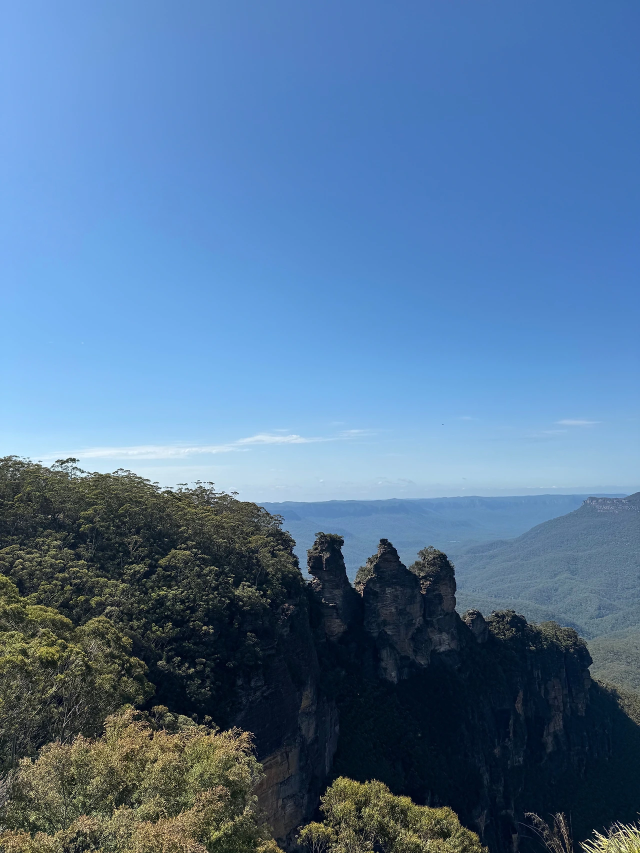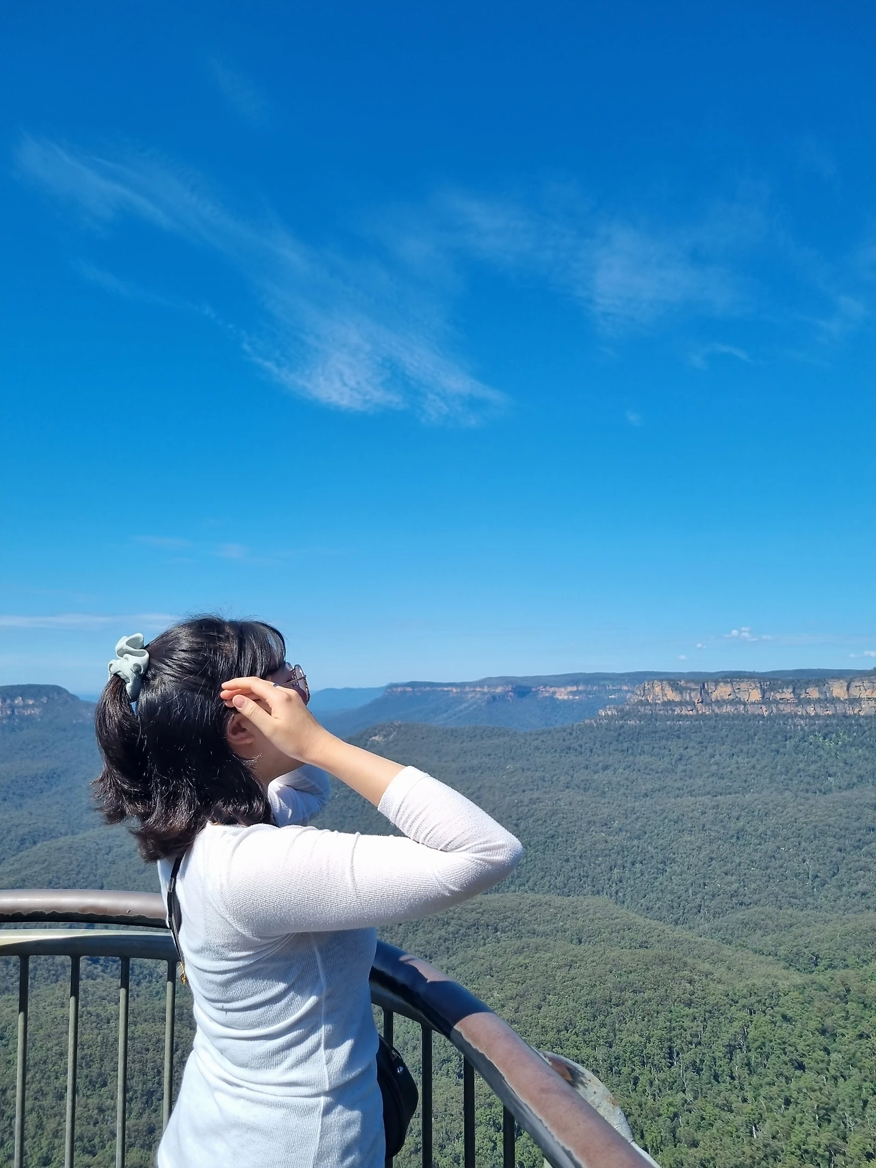 이 날도 시드니 근교, 블루 마운틴 투어를 하는 날이다. 이곳은 절벽에 앉아서 인생샷을 찍는 장소로 유명하다. 보통 이런 위험해 보이는 인생샷을 찍는 장소는 사실상 바위가 그렇게 튀어나와 있어서 위험해 보일 뿐 실제로는 밑에 땅이 있어서 위험하지 않다고 들었다. 그런데 이곳은 그냥 위험한 절벽이 맞았다. 의외로 겁이 많은 나는 사진을 찍어주겠다는 가이드의 말에 한 번 거절을 했는데 남는 건 사진뿐이라는 가이드님의 말에 찍기로 했다. 절벽까지 네발로 기어서 간 다음 절벽에 발을 뻗었다. 포즈로 뭐고 겁이 나서 인생샷은 건지지 못했다. 풍경만 예쁠 뿐. 비교적 안전한 곳에 가서 사진을 찍었다.