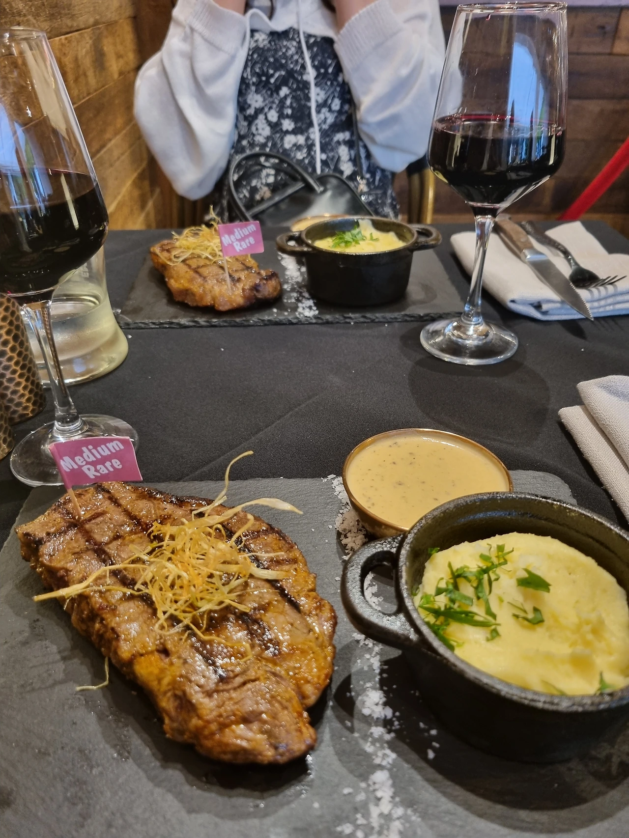 이렇게 오전에는 동물원을 보고 점심을 먹으러 갔다. 또 예쁜 카페에서 점심을 먹고 본다이 비치에 갈 계획이었다. 본다이 비치는 호주에서 아름다운 해변가이다. 그리고 바닷물이 들어오는 수영장도 있다. 그런데 웬걸 비가 억수같이 쏟아졌다. 우산도 없는데 말이다. 금방 그치는 비일까? 아니면 계속 이렇게 올까? 고민하다가 비를 피할 곳도 없고 이대로는 해변가에 가는 것도 위험하다는 생각이 들어서 다시 시내로 돌아갔다. 시내를 구경하고 가성비가 좋은 스테이크 식당에 갔다. 레드 와인과 함께 스테이크가 나온다. 호주에 와서 나름 고기도 썰었다고 말할만한 맛이었다.