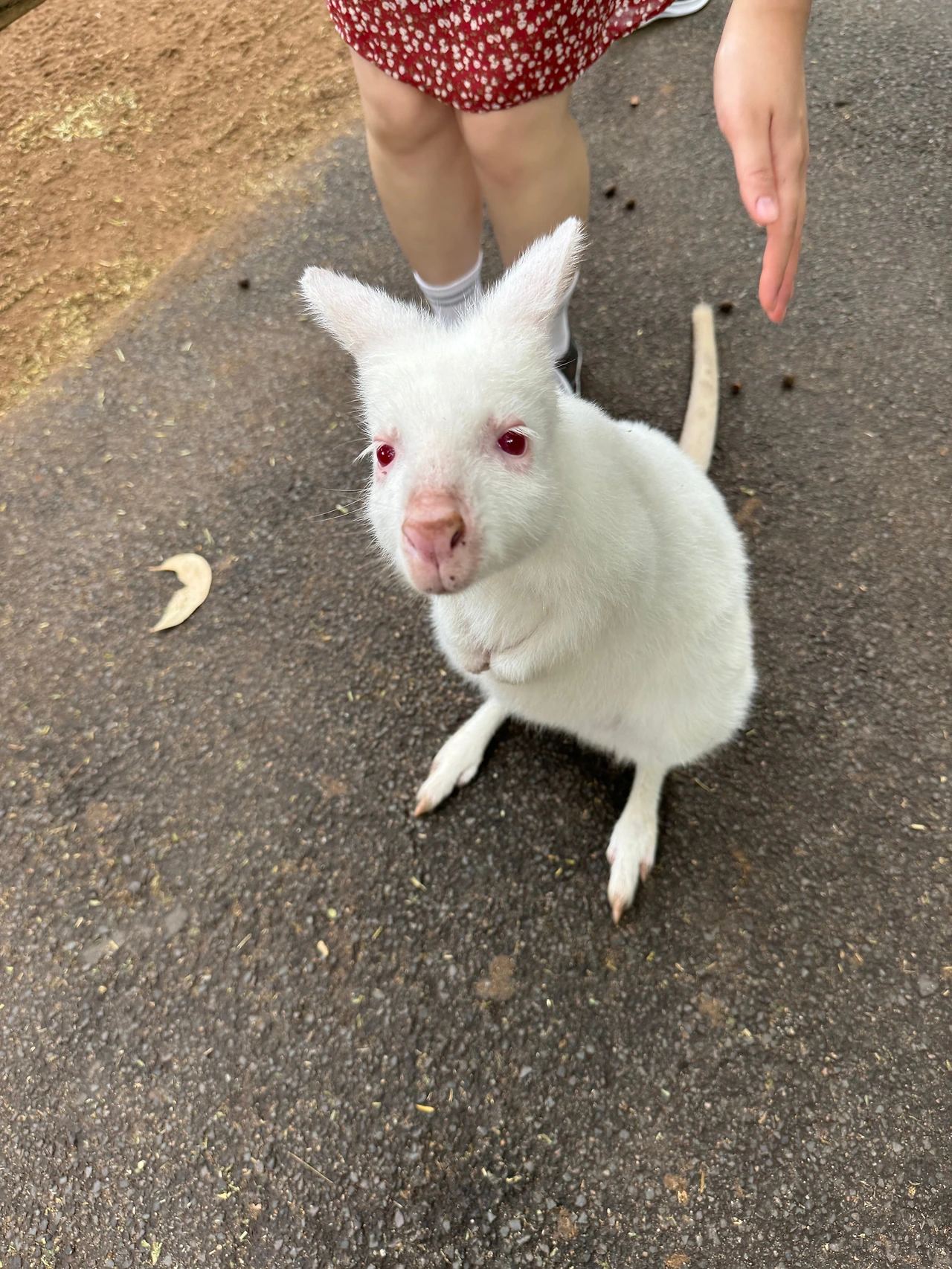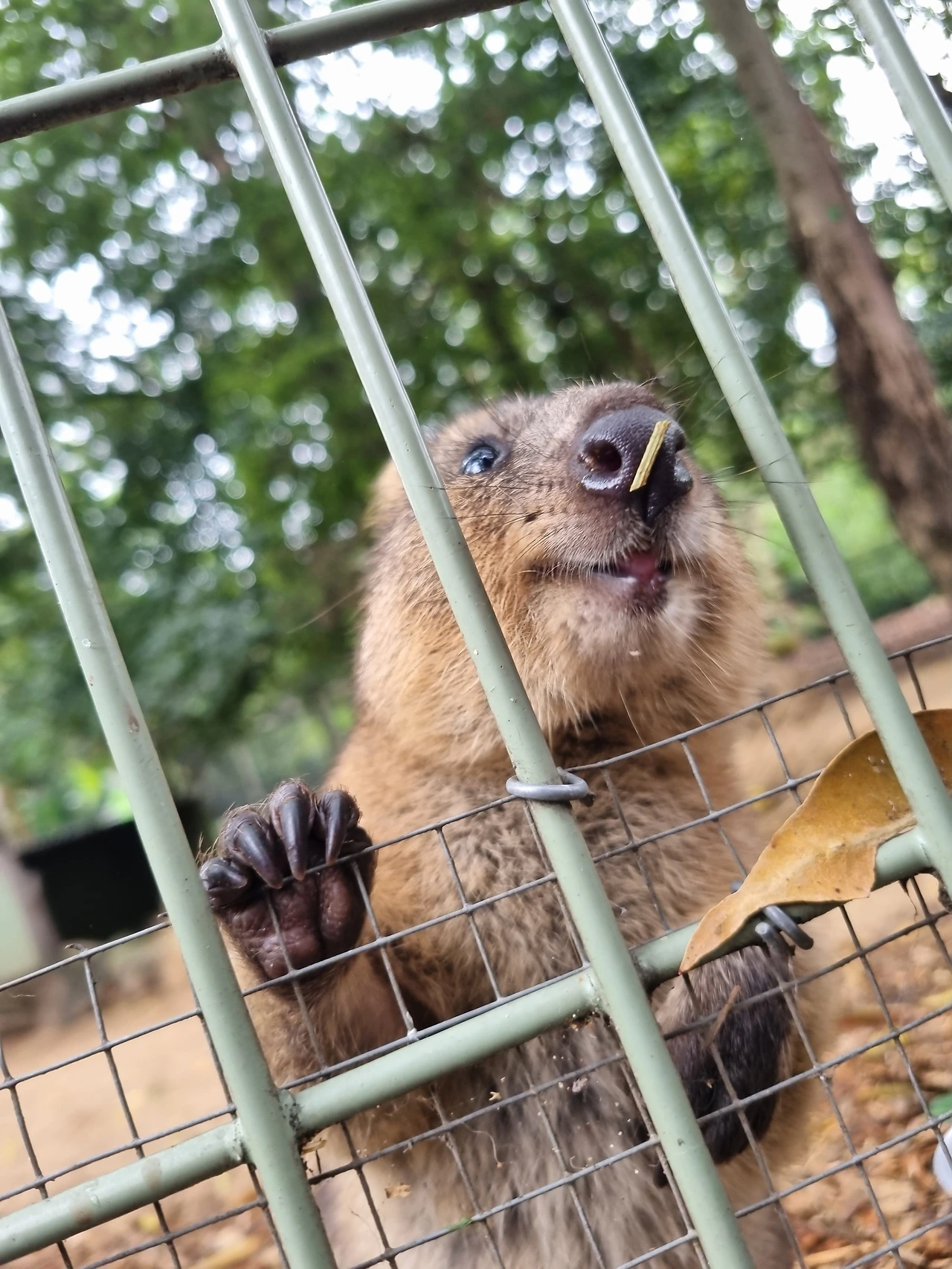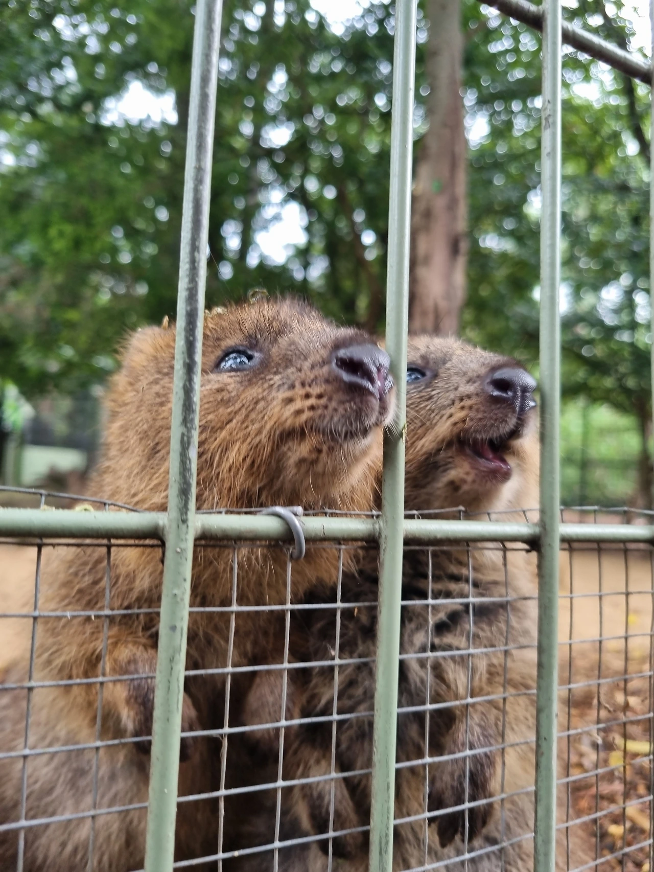 이날은 제일 기대되는 동물원에 가는 날이다. 이 동물원에서만 쿼카를 볼 수 있다. 쿼카를 가까이에서 보기 위해 쿼카를 유인할 먹이를 사고 입장하자마자 쿼카가 있는 곳으로 갔다. 다른 동물들은 쿼카를 보고 난 후에 보기로 했다. 쿼카가 있는 곳에 도착. 귀염뽀짝한 쿼카 세 마리가 우리를 보고는 울타리 가까이 왔다. 그런데 쿼카 첫인상은 귀엽지만 낯설었다. 왜냐하면 쿼카는 항상 웃고 있는 동물로 유명하다. 그런데 각도빨이었다. 쿼카도 캥거루과이다. 그래서 주둥이가 꽤 길다. 그리고 생각보다 작지 않다. 기니피그보다 조금 더 크다. 그래도 근육질 캥거루보다 훤씬 귀엽다. 울타리가 쳐져 있어서 어떻게 먹이를 줄 수 있을까 고민했지만 먹이를 가까이 하니 작은 손으로 쥐어서 먹이를 가져갔다. 그 모습이 웃기고 귀엽다. 30분 정도는 쿼카만 본 것 같다. 먹이가 거의 동이 날 때쯤 쿼카와 인사하고 다시 동물원 입구에 가서 다른 동물을 구경했다.
